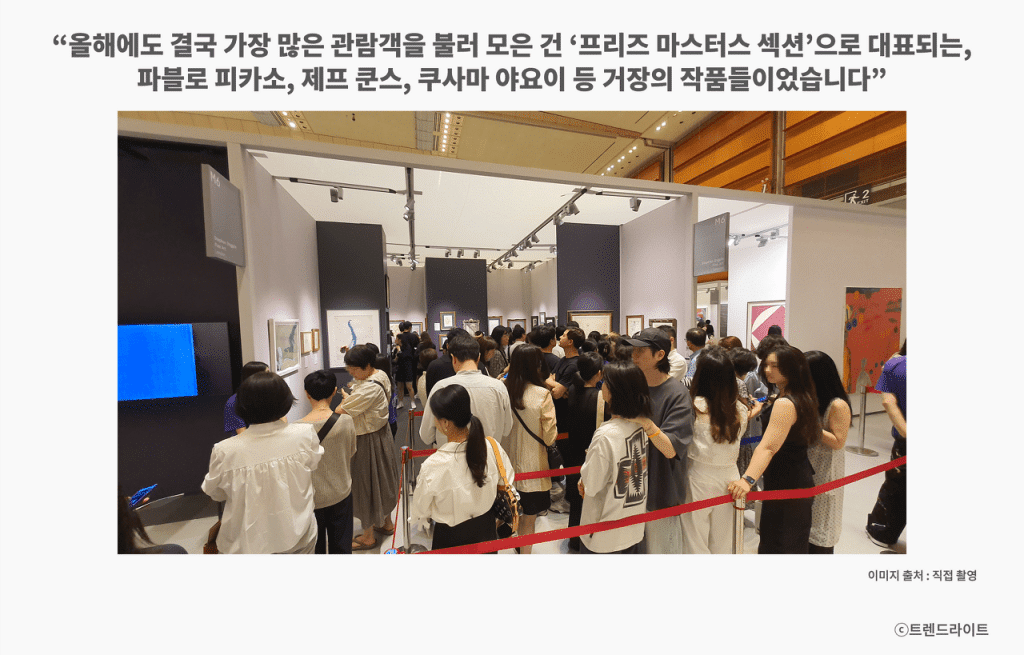 키아프가 원했던 건, 아트페어를 기점으로 대중들의 관심이 쏠리고, 이들이 자연스레 컬렉터로 성장할 수 있는 계기를 마련해 주는 것이었을 텐데요. 프리즈가 피카소와 같은 대가들의 작품을 가져오면서, 확실하게 아트페어는 역대급 흥행에 성공하게 됩니다. 실제로 행사장 내에서도 사람이 몰린 곳은 이러한 유명 작가들의 작품을 볼 수 있는 곳이었고요. 이렇게 형성된 대세감 덕택에 키아프와 프리즈는 연일 북적거릴 수 있었습니다.