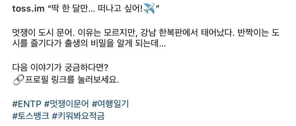 토스의 경우, 게시글을 읽은 사람들이 ‘프로필 링크’를 눌러 나머지 이야기를 확인할 수 있도록 하는 게 가장 중요하다. 그래서 프로필 링크를 누르라는 문장 옆에 링크 이모티콘을 달아 눈에 확 띄게끔 했다.