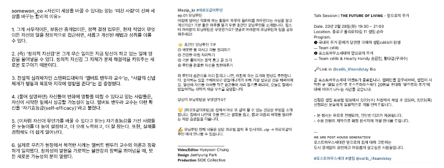 인스타그램 계정을 운영하다보면 종종 많은 내용을 하나의 게시물에 담아야 할 때가 있다. 캡션을 작성하는 것도 고민이지만, 어떻게 하면 이 캡션을 읽는 사람들이 내용을 모두 이해할 수 있게끔 보기 좋게 담을 지도 고민이다. 다른 계정에서는 어떻게 긴 내용을 효과적으로 담아내고 있는지 17가지의 실제 사례를 모았다.