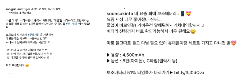 내용 사이에 적절하게 줄을 띄워주는 것도 있다. 부부티하우스는 단락마다 줄을 띄워, 다소 길수도 있는 내용이 잘 읽히게끔 했다. 오른쪽의 준맛탱 계정은 본문의 가로 길이를 의도적으로 동일하게 맞춰 본문 내용에 집중하게 하는 효과를 만들었다.