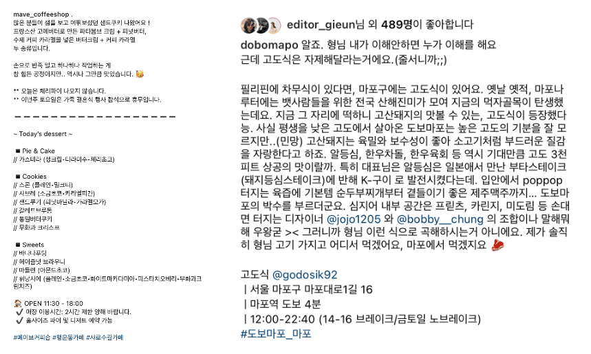 키보드에 있는 기호로도 캡션 내용을 깔끔하게 정리할 수 있다. 왼쪽 베이커리이자 카페인 메이브커피숍은 슬래시를 두 번 눌러 ‘//’ 그 날 나오는 메뉴를 강조했다. 서울 마포구의 좋은 장소를 소개하는 도보마포의 경우는 다녀온 곳에 대한 후기글의 글이 많은 편인데, 캡션 마지막에 식당 정보에만 ‘ㅣ’를 활용해 들여쓰기의 효과를 내면서도 내용의 가독성을 높였다.