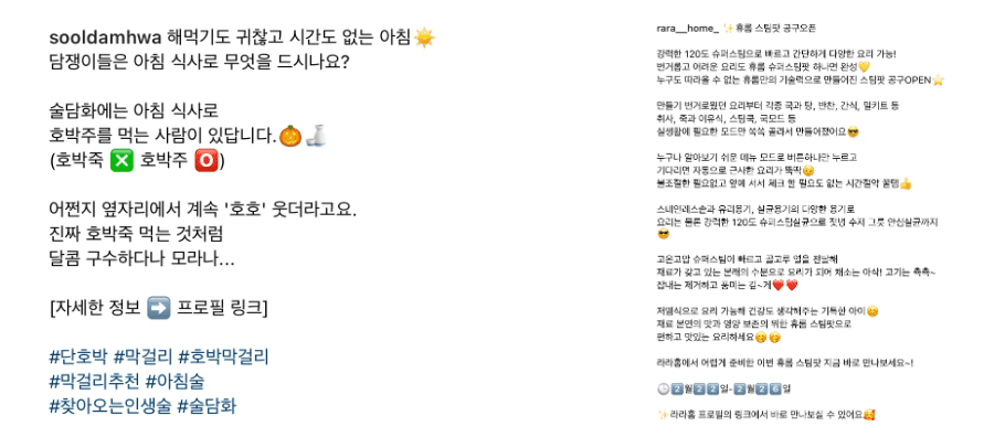 꼭 강조하고 싶은 곳을 이모티콘으로 눈에 띄게 강조할 수도 있다. 술담화 계정의 경우 ‘호박죽’과 ‘호박주’를 혼동할 가능성이 있기에 이모티콘으로 O/X를 표시해 내용이 눈에 잘 띄게 했다. 라라홈은 게시물에 공구 소식을 담았는데 공구 일정을 강조하기 위해 날짜를 이모티콘으로 표시해 더욱 가시성을 높였다.