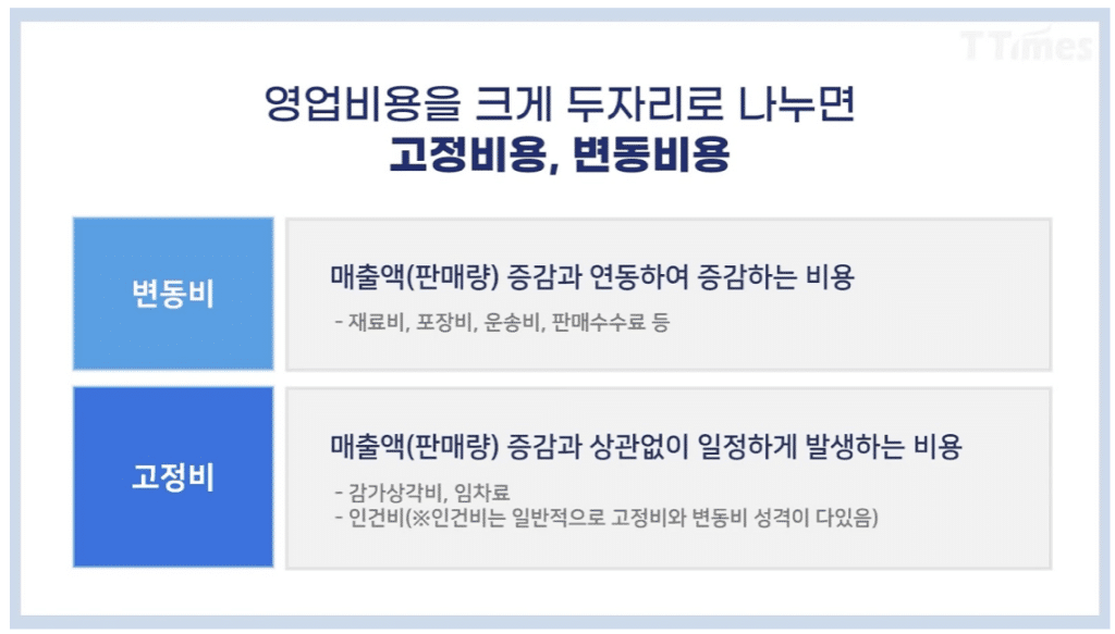 – 공헌이익을 계산할 때 고정비는 제외됩니다. 변동비와 고정비의 차이는 티타임즈에서 만든 아래 표를 참고하시면 됩니다. 공헌이익에서 고정비를 빼면 기업의 영업이익을 계산할 수 있습니다.