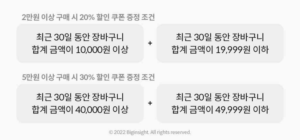 ⦁ 최근 30일 동안 장바구니 합계 금액이 10,000원 이상 AND 최근 30일 동안 장바구니 합계 금액이 19,999원 이하 - 5만원 이상 구매 시 30% 할인 쿠폰 증정
