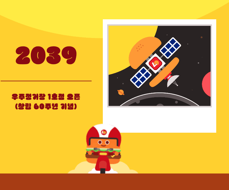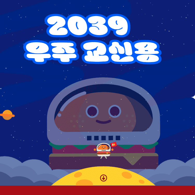 1979년 롯데리아의 정식 개점부터, 1977년 최초의 드라이브스루 형태 매장 개점, 1998년 베트남 지점 진출, 불고기버거나 라이스버거 같은 전 국민이 좋아하는 버거를 먼저 출시해 왔다는 이력들을 연대기 형태로 정리해 두었어요. 그렇기 때문에 우주교신용 서체 출시란, 이렇게 도전해 온 롯데리아가 2039년에는 우주점을 최초로 내보겠다는 흥미로운 마케팅적인 선언인 것이죠. 1979년부터의 업력을 자랑하지만, 그럼에도 불구하고 ‘도전정신’이라는 새로운 프레임을 통해서 더 젊고 개척적인 브랜드라는 느낌이 들어요. 즉 서체는 이렇게 브랜드의 정체성이나 방향성을 압축해서 보여줄 수 있다는 점에서 의미가 있어요.