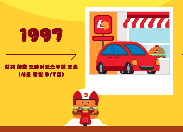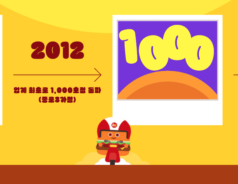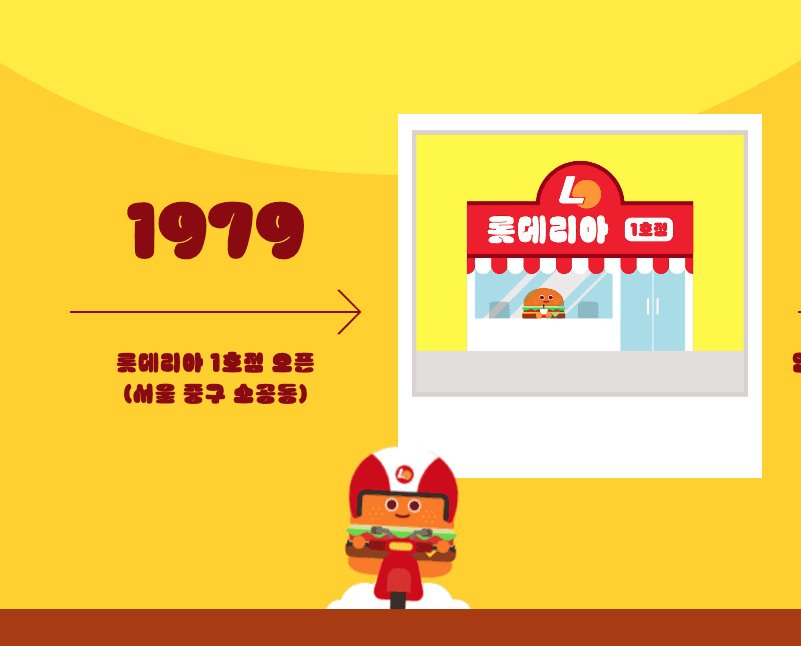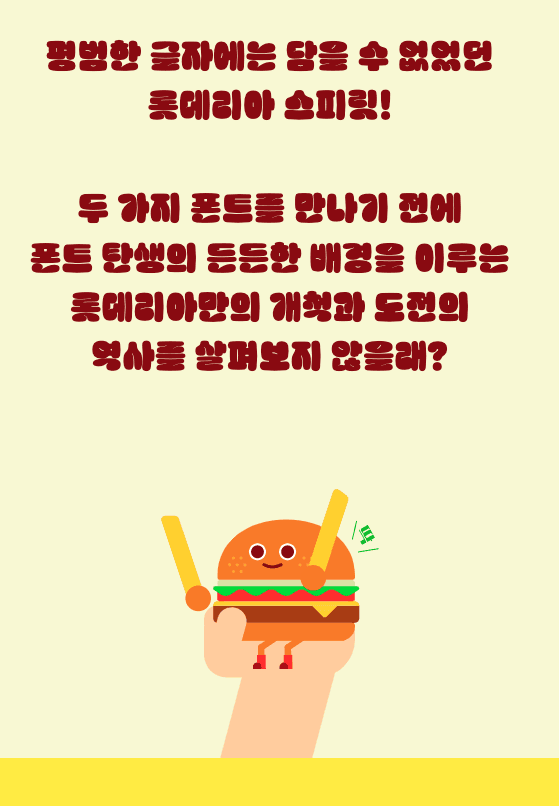 ‘촵땡겨체’와 ‘딱붙어체’는 2023 우주교신용 서체라는 컨셉으로 만들어졌는데요. 이게 갑자기 무슨 소리냐고요? 롯데리아폰트 홈페이지에 따르면 이 컨셉은 사실 롯데리아의 ‘도전정신’이라는 브랜드 방향성을 풀어내기 위해서 만들어진 컨셉이에요. 이를 뒷받침하기 위해서 롯데리아는 귀여운 일러스트를 활용해서 브랜드 사업이력을 만들었는데요.