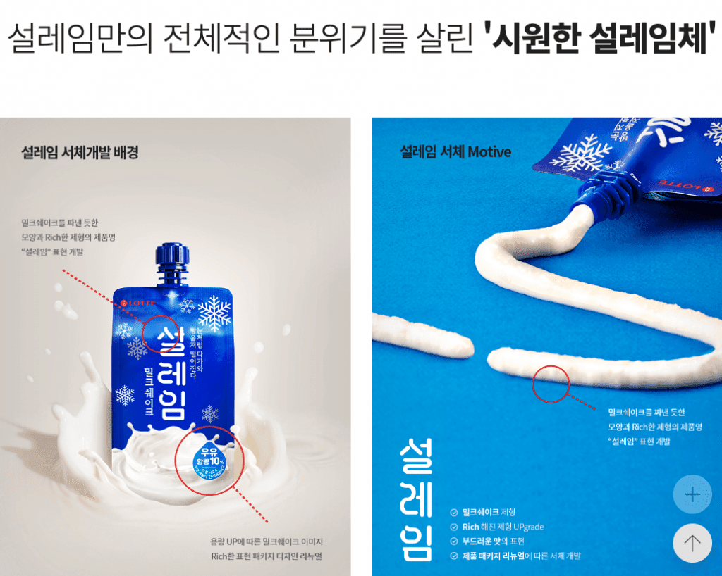 그러면 이와 비슷한 유통기업들의 사례들을 볼까요. 롯데제과는 작년 출시 20주년을 맞아서 아이스크림인 ‘설레임’의 느낌을 따서 ‘시원한설레임체’를 출시했어요. 2003년 출시된 설레임을 모르는 사람은 아마도 없을 것 같은데요. 시원한설레임체를 보면, 고운 입자의 얼음 같은 슬러쉬인 설레임의 맛을 서체로 표현해서 글자 자체에 아이스크림의 질감이 느껴지는 것 같기도 해요. 서체만 보아도 아이스크림이 바로 떠오른다니, 엄청난 이미지적인 구현이 아닐까 싶은 사례입니다.