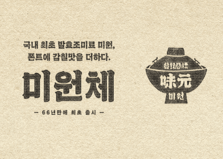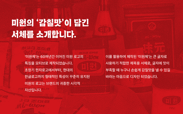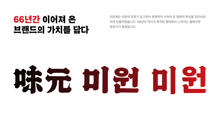 미원은 이번 서체 출시를 통해 조미료 미원이 ’66주년’이라는 점을 강조했습니다. 앞서 보았던 롯데리아가 영한 느낌으로 브랜드를 재이미지화하는 것과는 정반대의 모습이라고 볼 수도 있을 것 같아요. 요새는 조미료를 잘 안 쓰는 추세이기도 하고, 특히 젊은 사람은 치킨스톡 같은 외국산 조미료를 더 자주 사용하는 모습도 흔하게 볼 수 있죠. 이런 점에서 미원은 보다 적극적으로 대표적인 한국의 조미료인 미원을 한국의 ‘감칠맛’으로 브랜딩 하려고 시도했다고 볼 수도 있을 것 같아요. 서체의 스타일부터가 굉장히 한국적인 느낌을 표방하고 있기도 합니다.