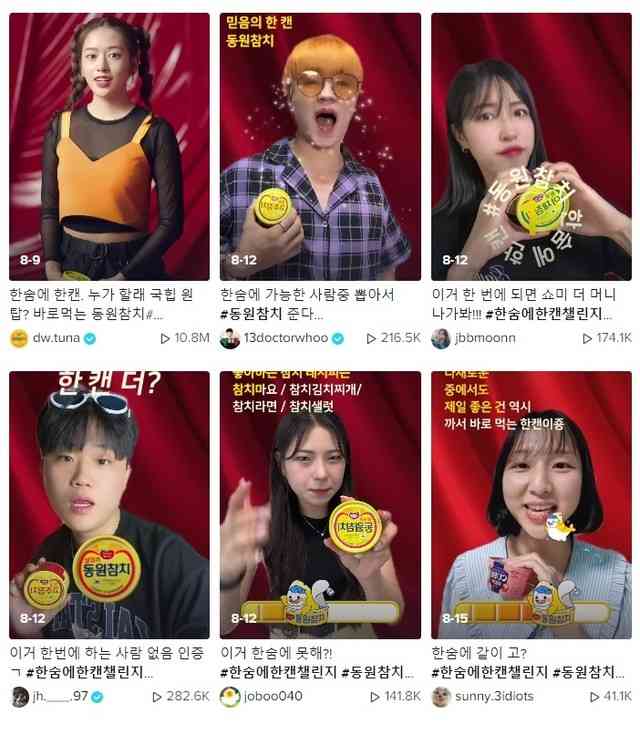 국내에서 시작해 해외로 확산된 지구 방위대 챌린지는 해시태그 조회수가 4억 2천만회에 달할 만큼 많은 참여를 이끌었어요. 한호흡으로 긴 문장을 말하는 챌린지를 활용한 동원참치 #한숨에한캔 챌린지는 틱톡 우수 광고 사례로 선정되며 틱톡 마케팅 성공사례가 되었죠! 이처럼 자발적 참여에서 오는 놀이의 즐거움을 활용해 틱톡 챌린지를 통한 마케팅이 주목받았습니다!