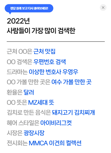 네이버에서는 네이버 포인트, 웹툰, 블로그 등의 연말 결산과 함께 검색 횟수가 100만 이상인 ‘키워드로 정리하는 2022’를 공개했어요. 특히, 엔데믹 국면을 맞은 만큼 프로야구 개막, 항공권 예약 등 야외 활동에 대한 검색량이 증가했는데요. 블로거들의 최애 장소로도 1위 더현대 서울, 2위 에버랜드 3위 광안리 해수욕장이 기록되었네요!