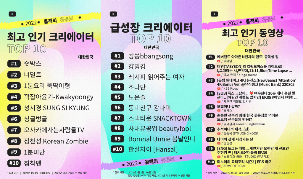 올 한 해 동안 유튜브에서 인기 있었던 영상과 크리에이터를 조명하는 2022년 인기 동영상 및 크리에이터 결산 리스트가 공개되었어요. 유튜브에서는 특히, 민간인 사찰이 아니냐는 말이 나올 정도로 현실적인 ‘하이퍼 리얼리즘‘ 콘텐츠가 각광받았죠! 스케치 코미디 유행을 선도한 숏박스, 너덜트와 같이 개그맨을 직업으로 가진 크리에이터 외에도 일반인들도 많이 도전하며 스케치 코미디 장르의 규모가 커지고 있어요.