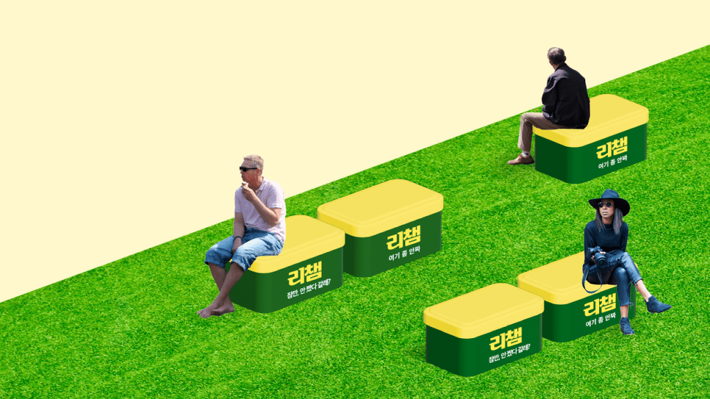 결과적으로 채택된 아이디어는 ‘안 짜’와 ‘앉자’의 발음 유사성을 활용한 벤치 아이디어이다. 유동인구가 많고, 앉을 곳이 필요한 공공장소에 리챔 패키지 모양의 벤치를 제작한다. 여기에는 “여기 좀 앉자”, “잠깐, 안 짰다 갈래?”와 같은 문구가 적혀 있다. 햄 모양의 방석을 얹어 둘지, 앉는 부분에 QR코드를 새겨 공유 이벤트를 할지도 고민했지만 전부 뺐다. 이 아이디어의 가장 큰 강점은 심플함이라고 생각했다. 뜬금없이 배치되어 있는 캔 햄 모양의 벤치가, 짜지 않다고 말하는 것. 그것만으로도 기억에 남을 것 같았고, 거기서 멈추는 게 나아 보였다.