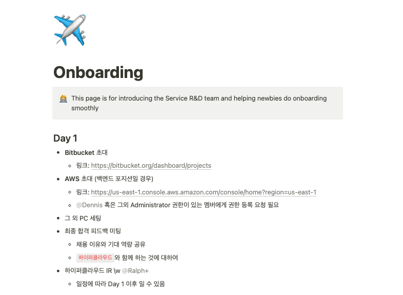 합격자는 하이퍼클라우드 로켓에 탄 멤버로서 온보딩(onboarding) 과정을 밟는다. 1일차부터 3일차까지는 업무에 착수할 수 있게끔 제반 사항을 안내받는다. 조직문화 전반도 이때 소개받는다.