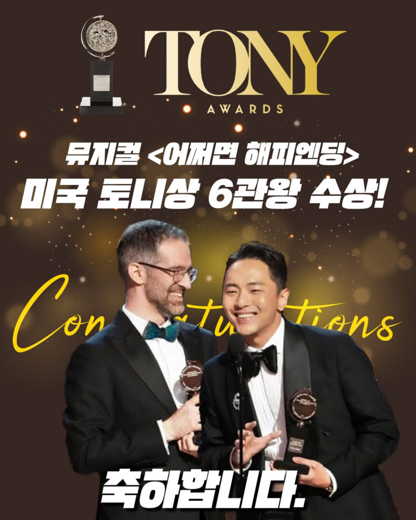 한국 창작 뮤지컬인 <어쩌면 해피엔딩(Maybe Happy Ending)>이 미국 토니상 시상식에서 작품상을 포함해 총 6개의 상을 탄 거에요.