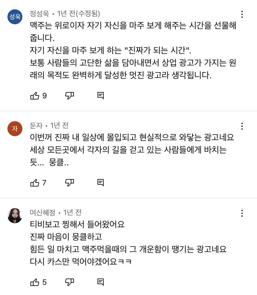 실제로 ‘진짜 멋진 여름/겨울 맥주 광고’의 댓글 반응은 모두 영상 속 인물들의 상황에 공감하는 모습이었습니다.