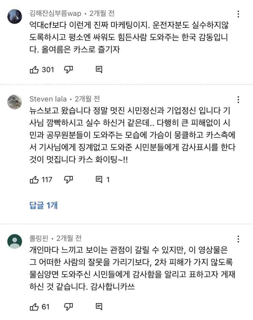 대부분 멋진 시민의식과 이에 감사하는 카스의 모습에 박수를 보내는 모습이었습니다.