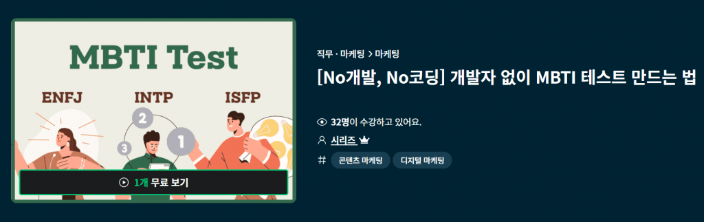 타입폼을 활용해서 최초로 성공적인 mbti 제작에 성공한 분의 회고록 같은 강의라고 해요! 복잡한 로직 파트도 영상만 따라서 하면 누구나 완성할 수 있다고 합니다.