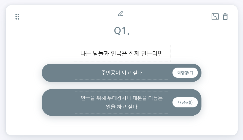 결과 배너 안에 동점 시 랜덤으로 보여주기, 결과 썸네일 공유하기 등 페이지 설정에 대한 다양한 옵션이 존재해요.특히 유용한 것은 이미 mbti의 대한 유형 분석을 기본적으로 제공하고 있다는 점인데요, 제공되는 정보 안에서 내용을 더 넣거나 빼는 등 자유로운 수정이 가능해요.