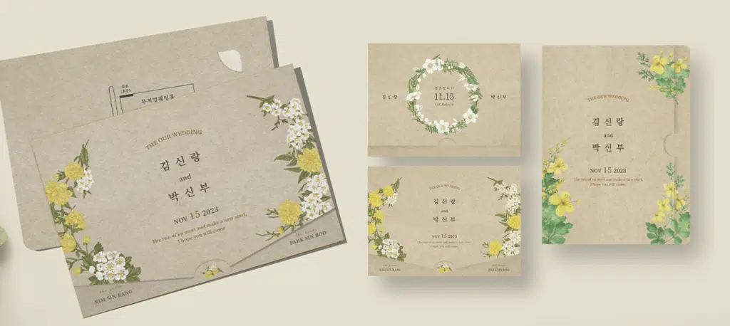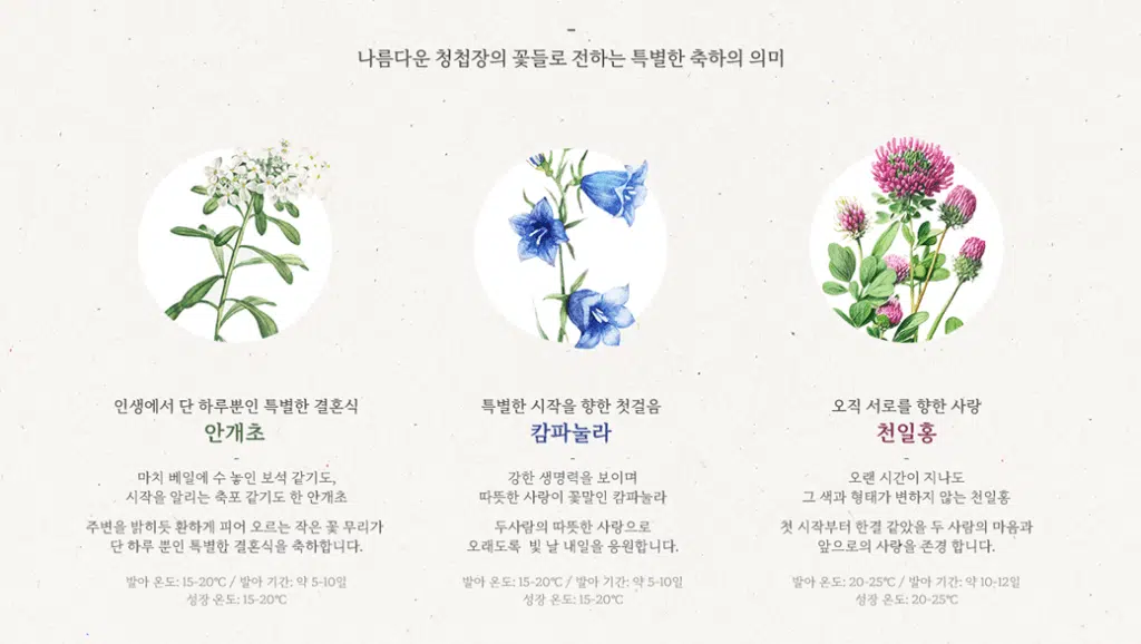 청첩장은 3가지 씨앗 중에 선택할 수 있는데요. 인생에 단 하루뿐인 특별한 결혼식을 의미하는 ‘안개초’, 특별한 시작을 향한 첫걸음 ‘캄파눌라’, 서로를 향한 사랑을 의미하는 ‘천일홍’ 세 가지 꽃 중에 하나를 선택할 수 있어요. 모두 신혼부부에게 유의미한 꽃말을 가지고 있다는 점에서도 특별하죠!
