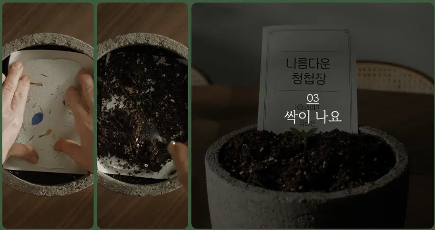 이런 고충을 해결할 방안으로 ‘씨앗 엽서’를 활용한 친환경적인 청첩장을 소개하는데요. 💌 ‘전국 중고생 자원봉사대회’에서 김태은 학생이 낸 아이디어인 ‘씨앗 엽서’를 활용하면, 꽃이 자라는 청첩장으로 버리지 않고 또 다른 생명으로 탄생할 수 있게 된다는 ESG 캠페인 영상이었어요.