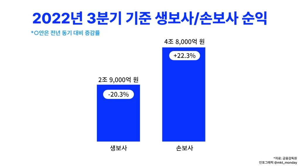 최근 고령화와 역대 최저 혼인율로 생명 보험에 신규 가입하고자 하는 수요가 뚝 떨어졌어요. 이미 고령층은 여러 보험에 가입하고 있고, 미혼인 MZ세대는 누군가를 위한 보험보다는 본인을 위한 손해보험 혹은 저축성 보험에 가입하는 게 일반적이니까요.
